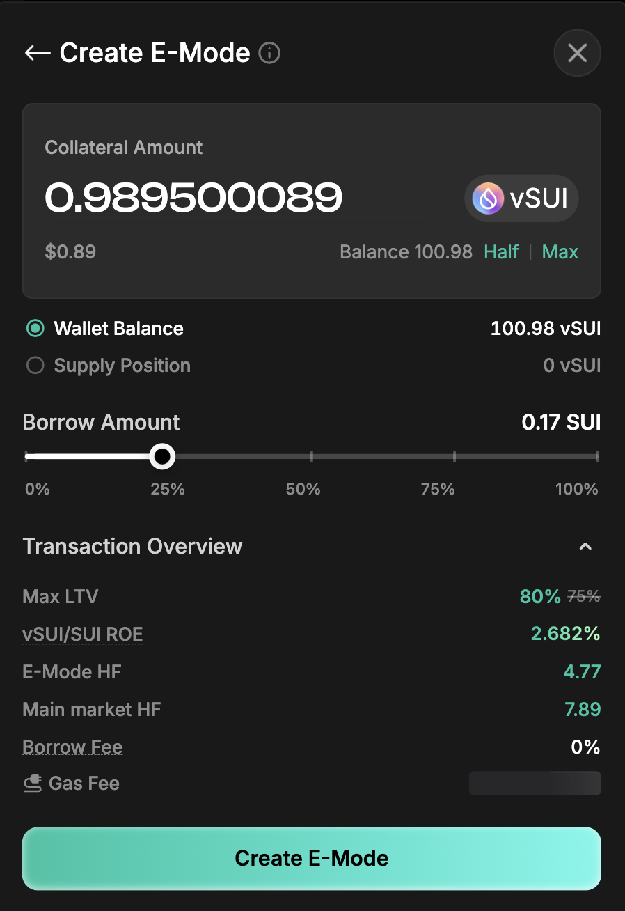 On NAVI, E-Mode is structured as a one-asset-to-one-asset pair, offering enhanced borrowing conditions compared to standard markets. When enabled, borrowers benefit from: